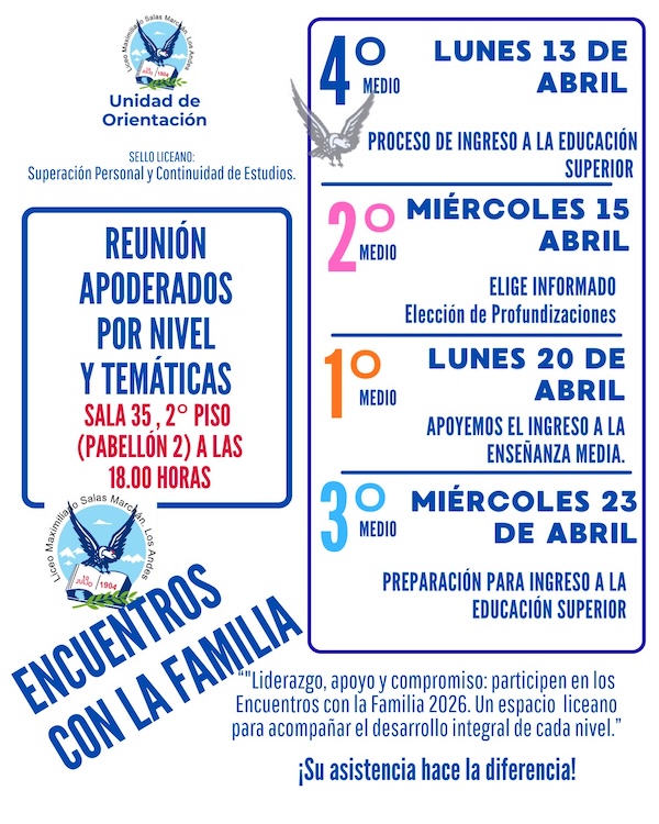 Estimada comunidad de madres, padres y apoderados del Liceo Maximiliano Salas Marchán: Junto con saludarles cordialmente, les extendemos una invitación a nuestras tradicionales Reuniones por Nivel, organizadas por Orientación. Estos encuentros representan uno de nuestros sellos institucionales más queridos, reflejando el compromiso compartido por la superación personal y la continuidad de estudios de nuestros jóvenes. [...]