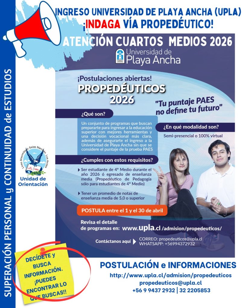Les informamos que la Universidad de Playa Ancha da inicio a una nueva versión del Programa de Propedéuticos UPLA 2026, iniciativa con más de 9 años de trayectoria que permite a estudiantes acceder a la educación superior sin considerar el puntaje de la PAES, mediante la aprobación del programa. Postulación 2026 • Inicio: 01 de [...]