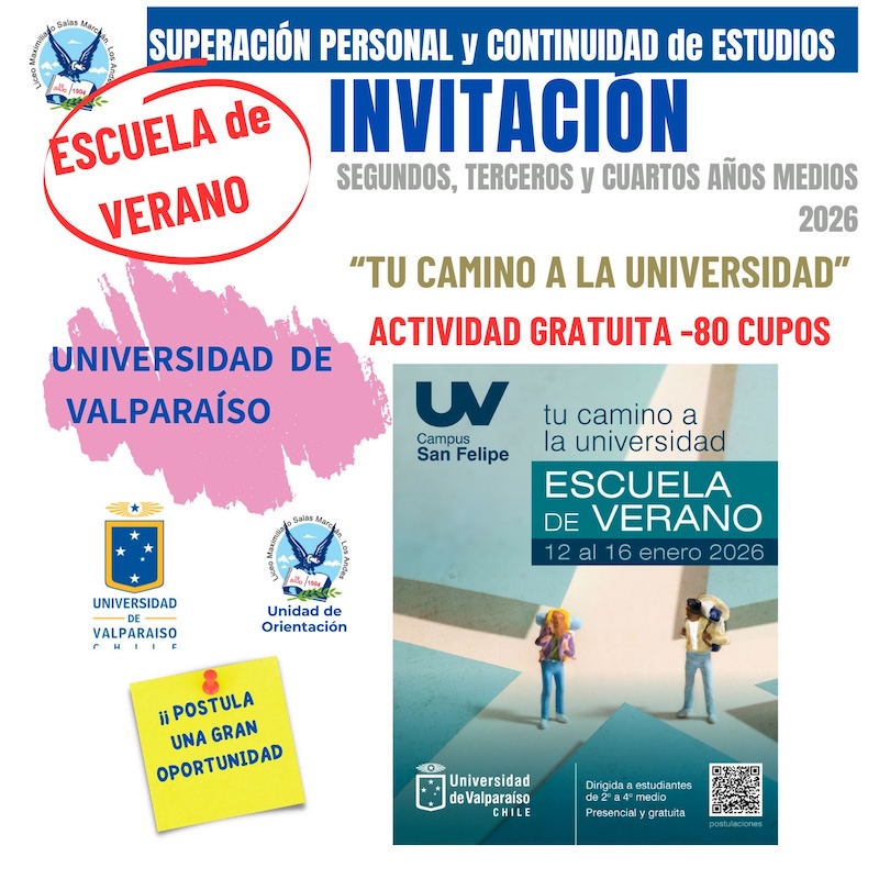 Invitación escuela de verano UV La Universidad de Valparaíso, una de nuestras principales redes externas, invita a nuestros estudiantes de 2°, 3° y 4° años medios 2026 a postular a uno de sus 80 cupos para la Escuela de Verano 2026, en el Campus San Felipe. Es una gran oportunidad veraniega camino a la universidad […]