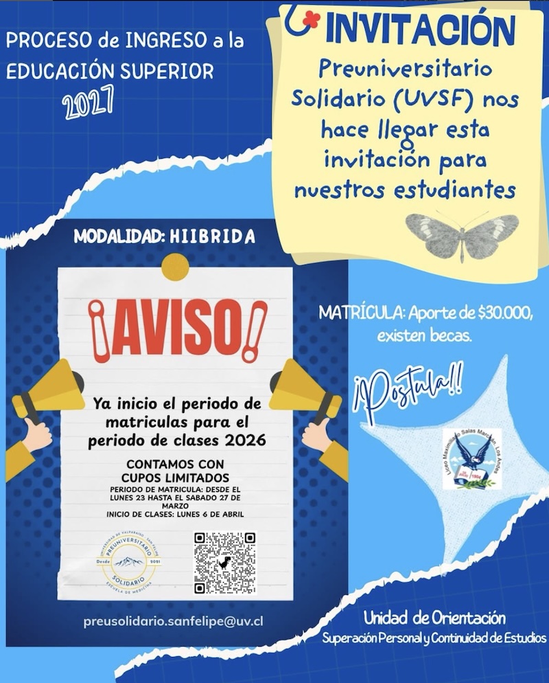 El motivo de este mensaje es informar a ustedes que el Preuniversitario Solidario (UVSF) ya ha dado inicio el periodo de matrículas para el ciclo académico 2026. La iniciativa tiene como objetivo, disminuir la brecha de ingreso a la educación superior, esto, mediante la entrega de los contenidos actualizados para rendir la PAES (prueba de [...]